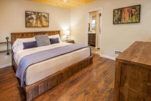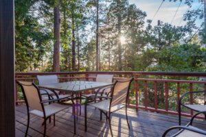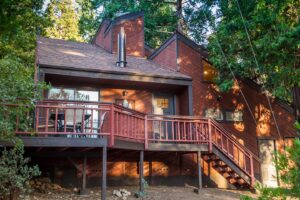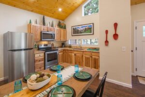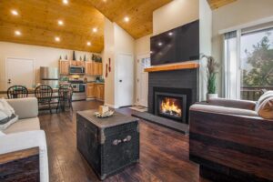 This three-bedroom, two-bathroom home features clean architectural lines and vaulted ceilings – with skylights that invite in natural light. The open floor plan includes a deck off the living room that is great for entertaining and for taking in the expansive mountain views. On the main floor, you’ll find the kitchen, dining room, living room, and master suite with king-size bed, full bathroom, and laundry. Upstairs you’ll find a large, full bathroom, and two more bedrooms with queen-sized beds and impressive morning views.
