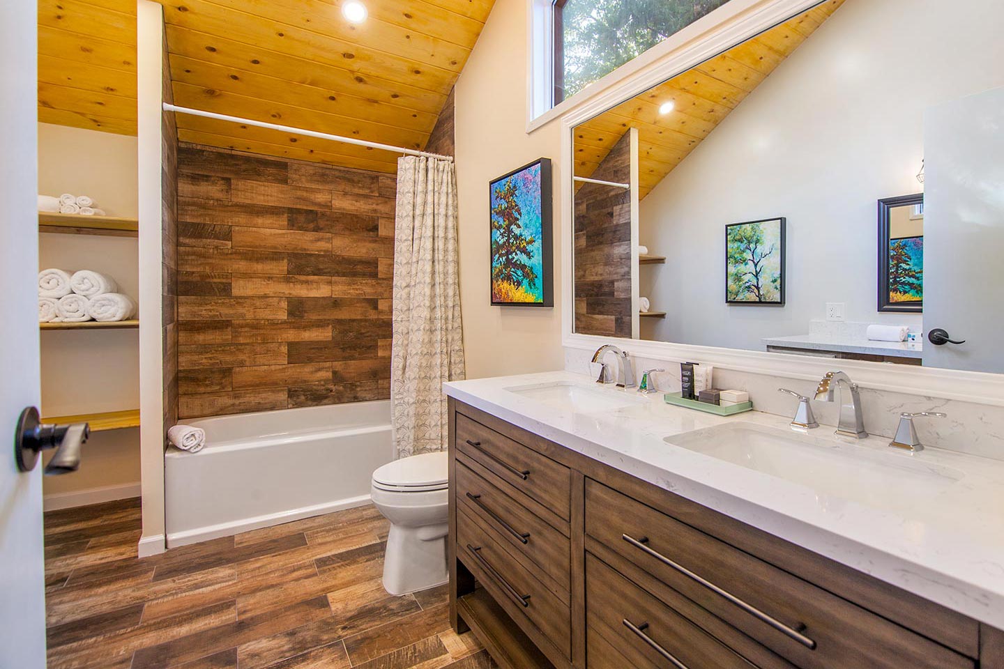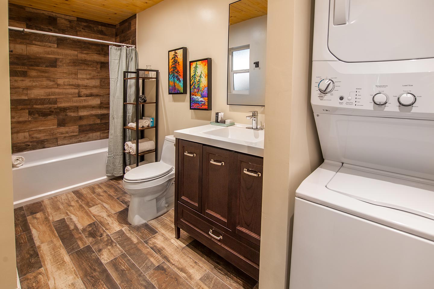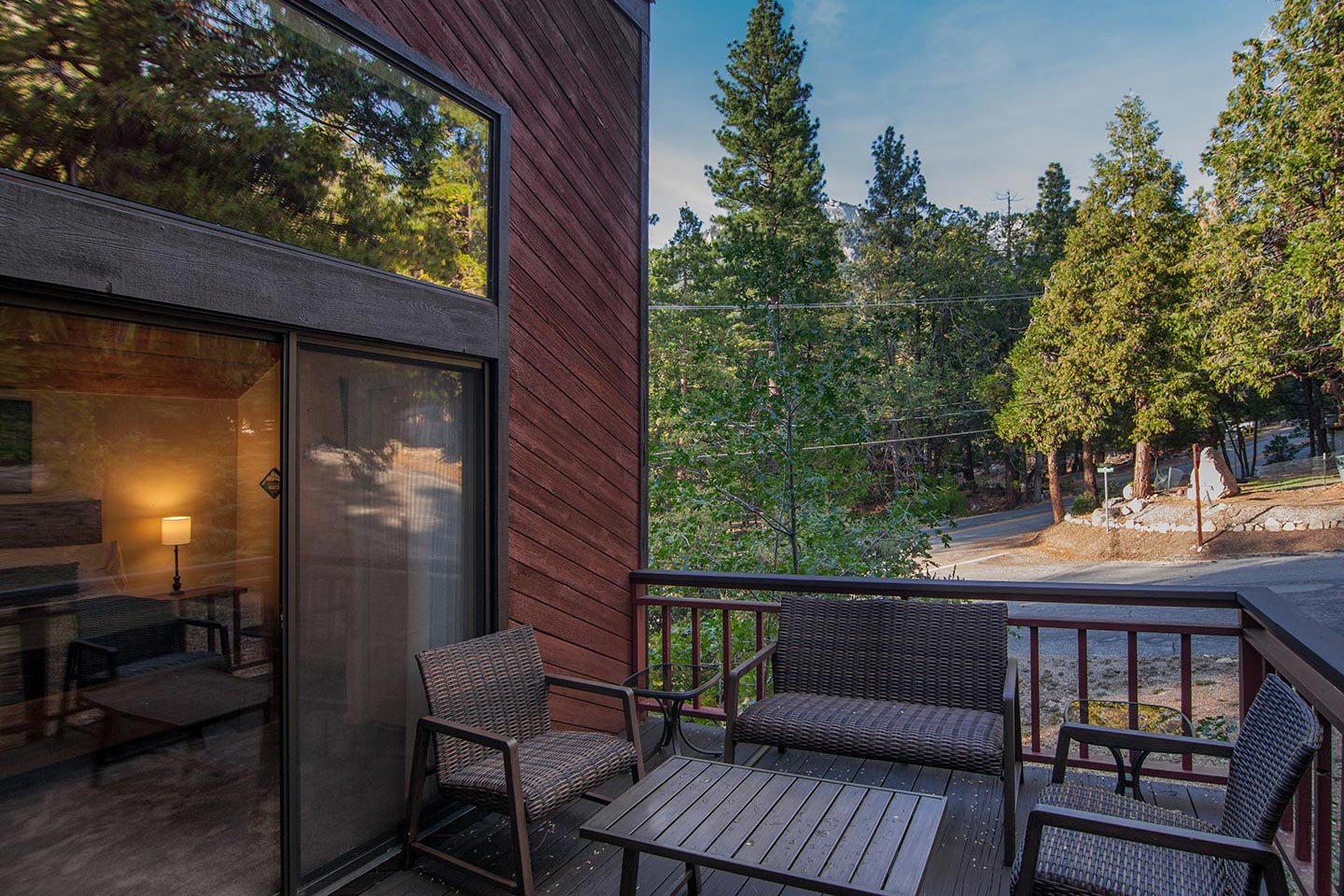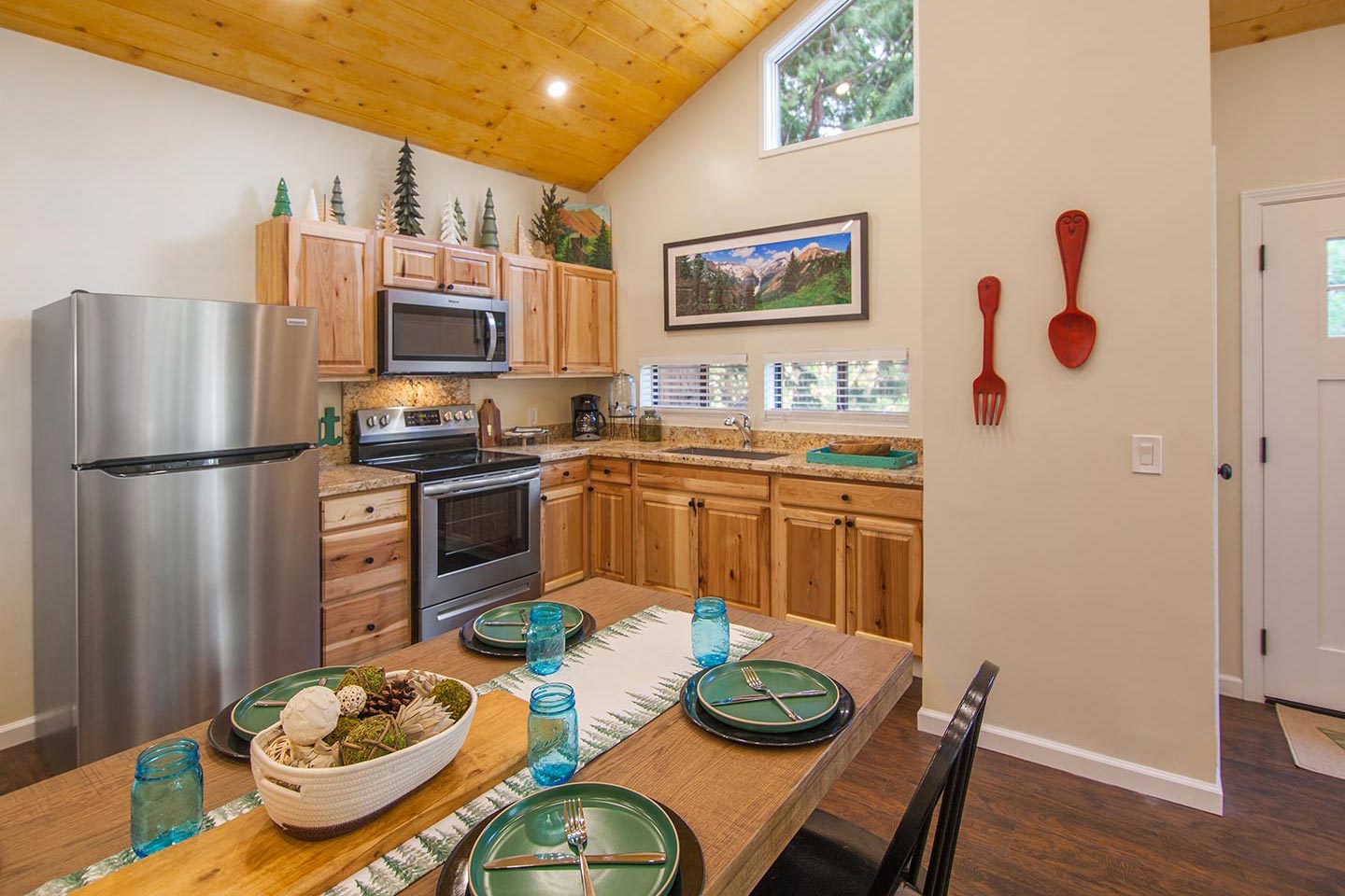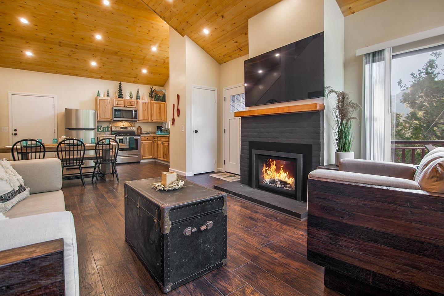 Enjoy the gas stove in the living room without having to light a fire. Both decks can be fully enclosed for your four-legged companions.